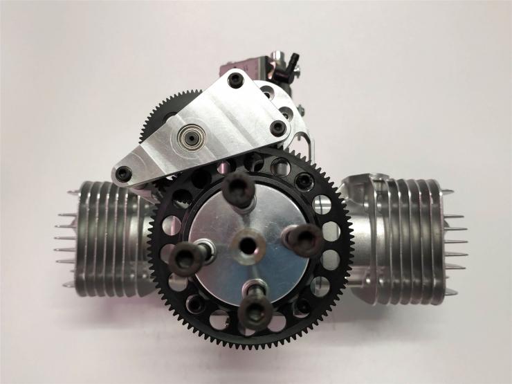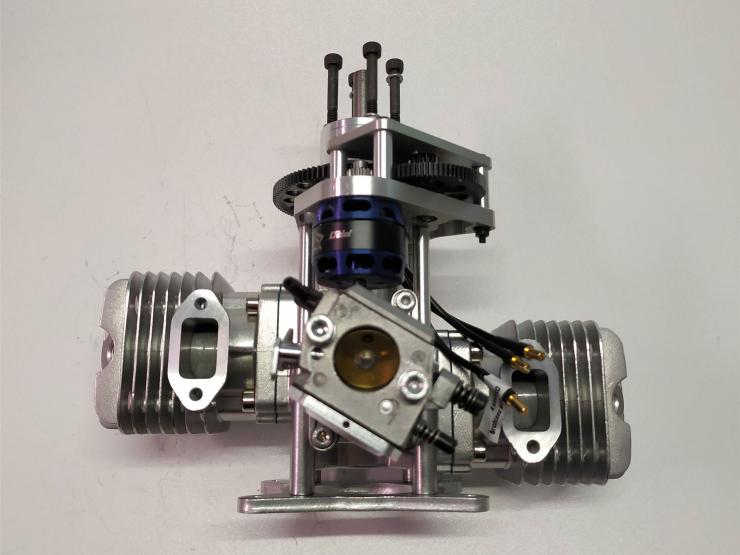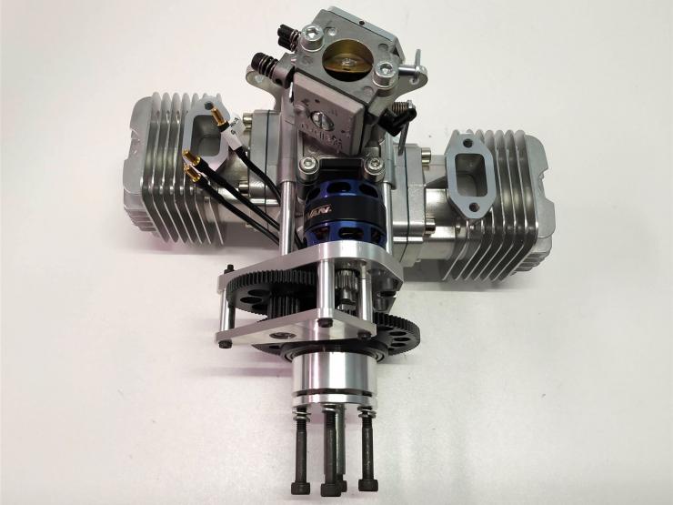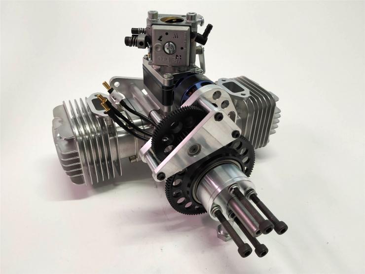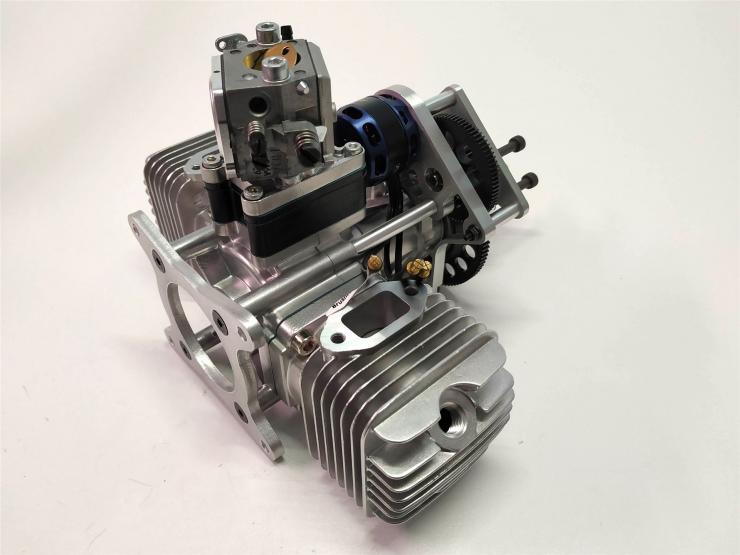 Der neue RCGF 70 Boxer hat schräg angeordnete Kerzen die den Motor sehr schmal aufbauen lassen .