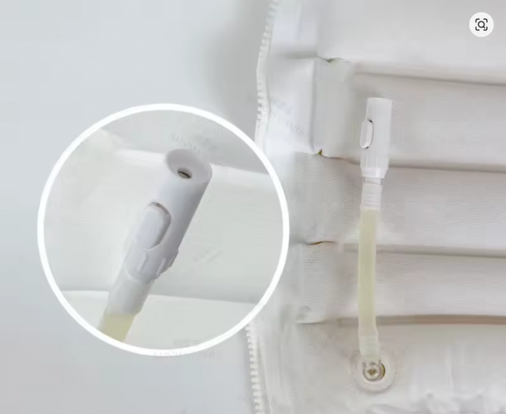 Die Jacke ist transparent so das, der Füllstand immer einsehbar ist die . Die Befüllung erfolgt am kragen der Jacke, der Ablauf am Bund unten . Sie benötigen keinen Akku und keine pumpe , völlig stromloser betrieb die Schwerkraft besorgt das zügige betanken .